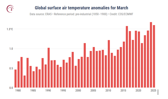 (हेर्नुस लामो अबधिमा गत मार्चको तापमान, १.५ डिसे माथि लगातार बढिरहेको चित्रः कोपर्निकस–३५)