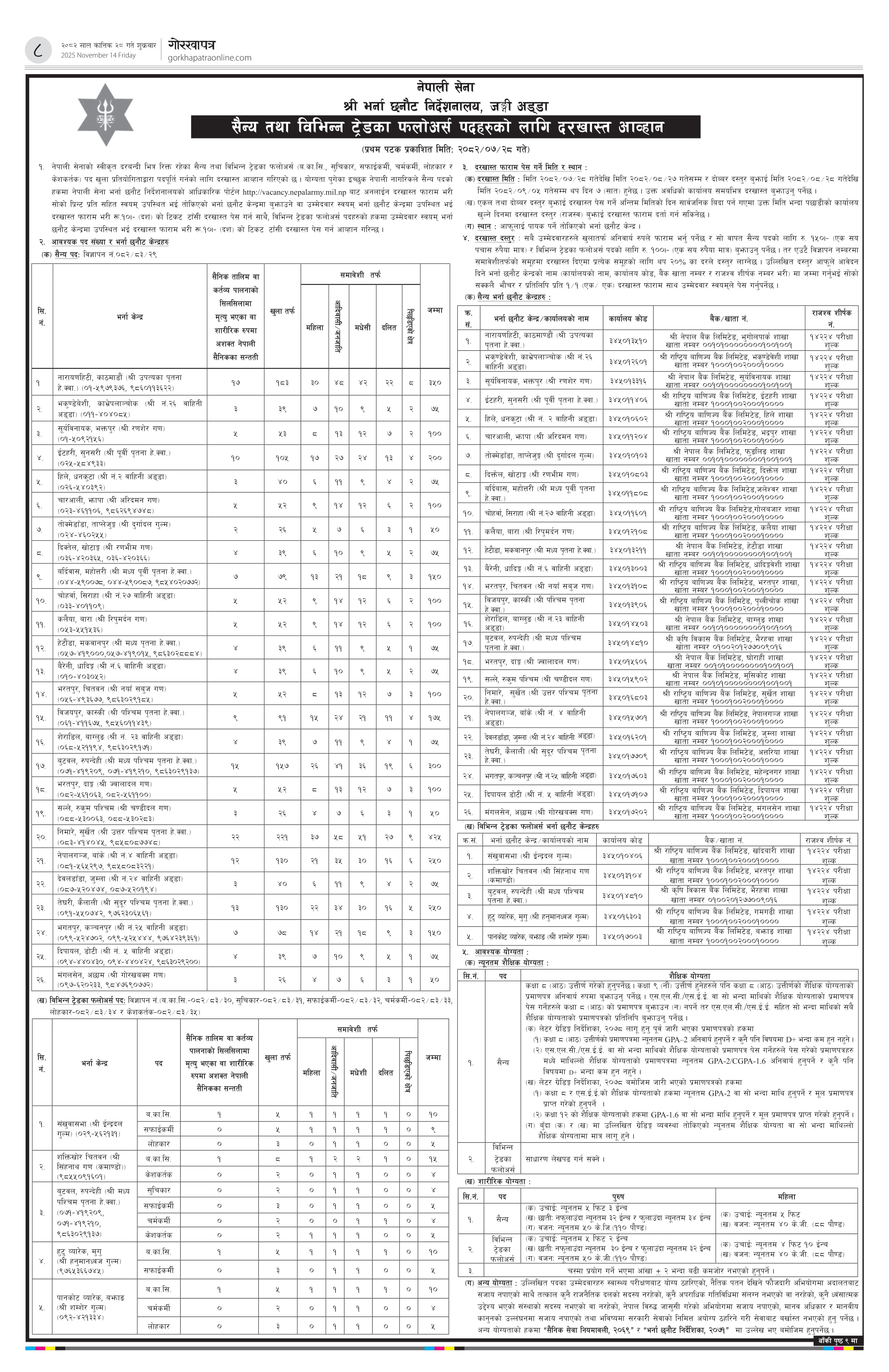 यससँगै सेनाले ब.का.सि, सफाइकर्मी, लोहाकार, केशकर्तक, सूचिकार, चर्मकर्मी लगायत विभिन्न ट्रेडका फलोअर्स पदका लागि पनि जनशक्ति माग गरेको छ। फलोअर्स पदमा आवेदन दिन साधारण लेखपढ गर्न सक्ने योग्यता नै पर्याप्त मानिएको छ।