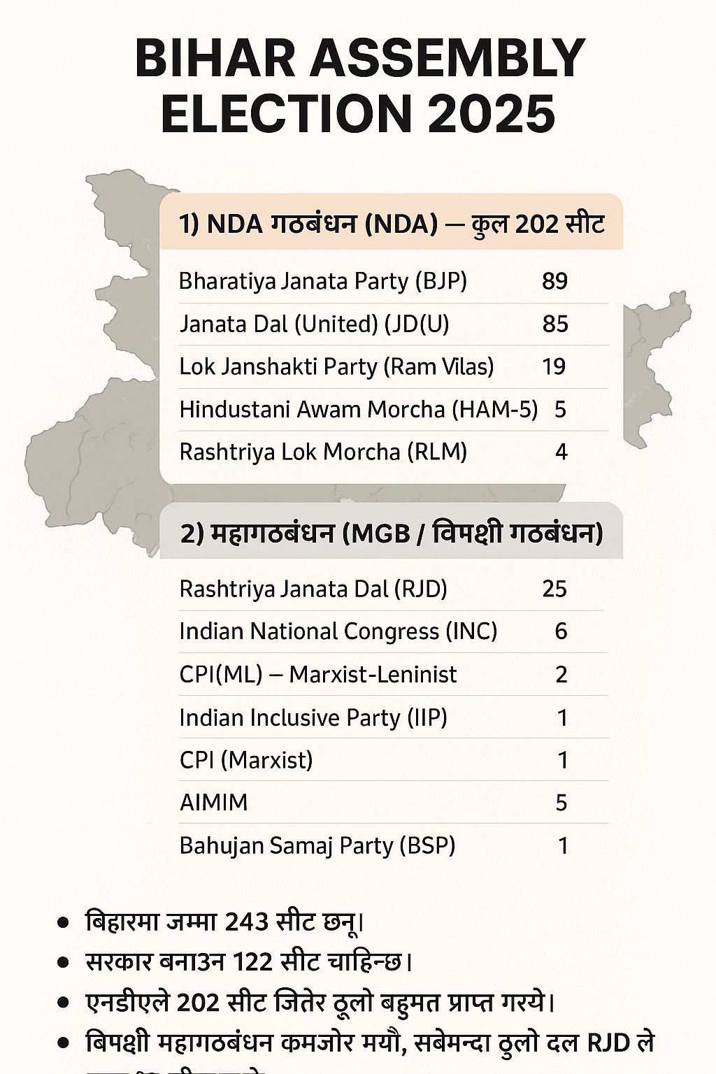 ЁЯЧ│я╕П рдмрд┐рд╣рд╛рд░ рд╡рд┐рдзрд╛рдирд╕рднрд╛ рдЪреБрдирд╛рд╡ 2025 — рдХреБрди рдкрд╛рд░реНрдЯреАрд▓реЗ рдХрддрд┐ рд╕реАрдЯ рдЬрд┐рддреНрдпреЛ?