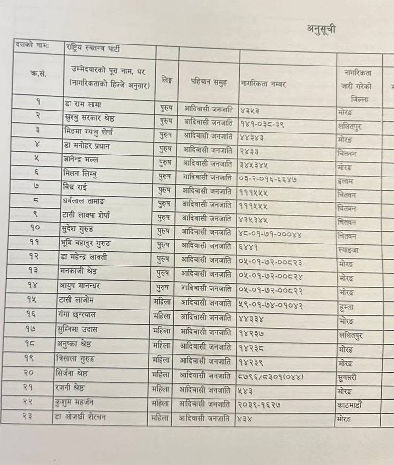 राष्ट्रिय स्वतन्त्र पार्टी (रास्वपा)ले आगामी निर्वाचनका लागि तयार पारेको बन्द समानुपातिक सूचीमा विभिन्न क्षेत्रका चर्चित व्यक्तित्वहरूको नाम समावेश गरेको छ। पार्टीको उक्त सूचीमा लोकप्रिय लोकगायक तथा कलाकार प्रकाश सपुत, राष्ट्रिय क्रिकेट टोलीका पूर्व कप्तान एवं क्रिकेटर ज्ञानेन्द्र मल्ल, साथै सामाजिक अभियन्ता रिमा विश्वकर्मासम्मका नाम परेका छ्न