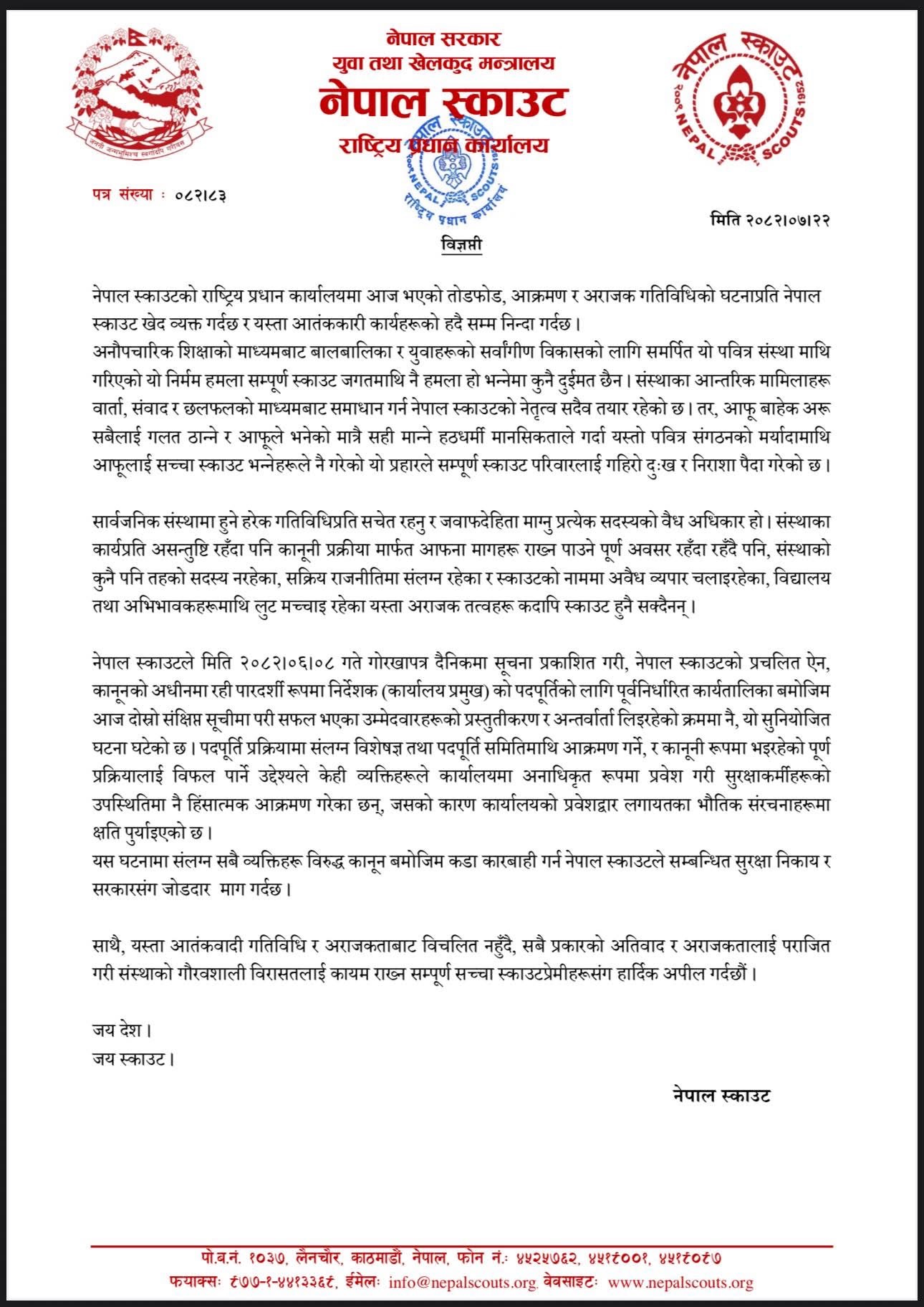 नेपाल स्काउट कार्यालयमा तोडफोड र आक्रमणप्रति कडा निन्दा