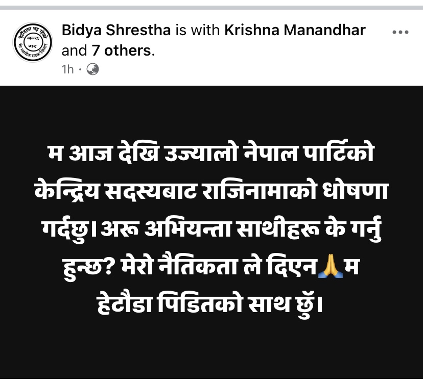 श्रेष्ठले सामाजिक सञ्जालमा लेखेकी छिन्, “म आजदेखि उज्यालो नेपाल पार्टीको केन्द्रीय सदस्यबाट राजीनामाको घोषणा गर्दछु।अरू अभियन्ता साथीहरू के गर्नुहुन्छ ? मेरो नैतिकताले दिएन। म हेटौडा पीडितको साथमा छु।