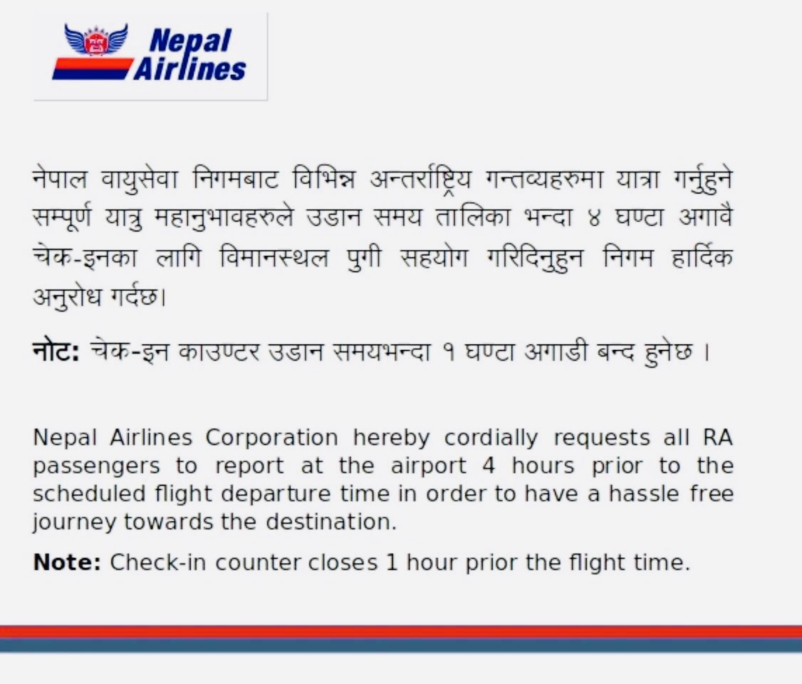 काठमाडौं – नेपाल एयरलाइन्सले अन्तर्राष्ट्रिय उडानमा जाने यात्रुलाई उडान समयको कम्तीमा चार घण्टा अघि काउन्टरमा उपस्थित हुन आग्रह गरेको छ। एयरलाइन्सले जारी गरेको सूचनामा काउन्टर उडान समयको एक घण्टा अघि बन्द हुने समेत उल्लेख गरिएको छ।